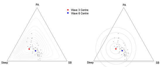 Figure 2 compares relative and absolute measures of distance. The compositional centers of Wave 3 time-use compositions (red) and Wave 6 time-use compositions (blue) of children with valid data at both LSAC waves (n = 2881) are shown. In addition, the time-use compositions of 50 randomly sampled children from Wave 6 are shown as grey datapoints. During the six years from Wave 3 to Wave 6, children increased their SB; the reallocated time came mostly from sleep and a little from PA. To quantify potential divergence from the Wave 3 time-use composition, we created an index of change, normalized to a range of [0,1], based on Aitchison distance.