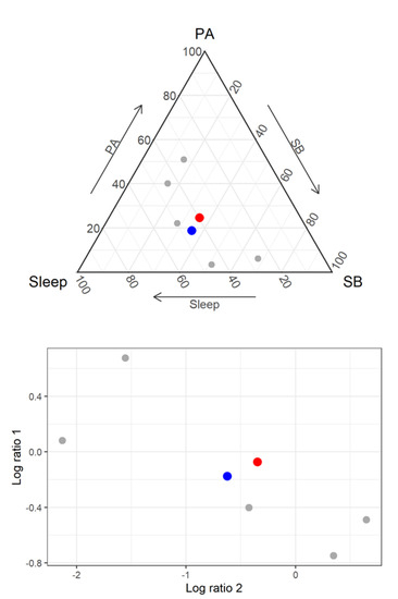To date, CoDA has been used to explore the cross-sectional and longitudinal associations between time use and health [42]. Most studies have considered a four-part activity behavior composition (sleep, SB, LPA and MVPA), usually derived from accelerometry. However, in this paper we demonstrate the CoDA approach using a three-part composition (sleep, SB, PA) because it is easy to visualize in two dimensions.
