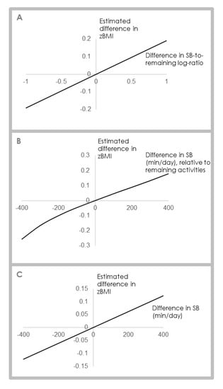 Relationship between daily activity behaviors (specifically SB) and zBMI. Panel A: Difference in zBMI associated with difference in SB-to-remaining activities expressed as a pivot coordinate, as estimated by compositional linear regression. Panel B: Difference in zBMI associated with difference in SB-to-remaining activities expressed in min/d, as estimated by compositional linear regression. Panel C: Difference in zBMI associated with difference in SB (min/d), as estimated by linear regression. Data are from the Longitudinal Study of Australian Children, Wave 6, birth cohort. All analyses adjusted for sex, age and socioeconomic position. zBMI = body mass index z-score; SB = sedentary behavior.