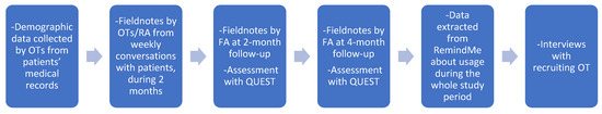 Flowchart describing the process of the data collection and used methods; OT—occupational therapist; RA—research assistant; FA—first author.