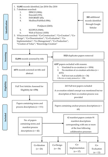 As shown in Figure 1, the 10 most frequently mentioned keywords were used to identify and review potentially relevant papers in a Preferred Reporting Items for Systematic Reviews and Meta-Analyses (PRISMA) compliant search [36]. Seven electronic academic databases were searched (Emerald, EBSCO (including CINAHL), Informit, ProQuest, PubMed, Scopus and Web of Science), as was Google Scholar to capture grey literature. The eligibility criteria included: (1) papers containing clear definitions or descriptions of co-creation-related processes or activities; (2) papers focused on the delivery of services, programs, policies or products; and (3) empirical and non-empirical papers published in either peer reviewed or grey literature. Both English and non-English citations (with English abstracts) were eligible. As earlier test searches of co-creation-related keywords with no date limitations retrieved a large amount of irrelevant material, the date range was limited to the period from 1 January 2014 to 1 November 2018. This time period allowed the retrieval of a representative sample of differing definitions and descriptions of contemporary co-creation-related terms. Author (TP) completed the search on the 3 November 2018. Search results were imported into Endnote X8, and duplicate citations were removed using the Endnotes’ duplicate identification tool. Rigorous manual checks for any remaining duplicates were also undertaken. The literature search, as shown in Figure 1, resulted in the identification of 12,094 articles, of which 5523 were duplicates, leaving 6571 papers for review. After exclusion of 6197 papers, the full-text versions of the eligible papers (n = 374) were exported from Endnote X8 into NVivo 11 Pro QSR. Author (TP) systematically checked and re-checked the 374 papers for evidence of definitions or descriptions of co-creation-related activities. At this stage, no detailed assessment of the definition was made, rather any identification of a process description resulted in the papers being included. Of these, 42 papers containing clear definitions or descriptions of co-created activities were identified. It is important to note that 69 additional papers also contained descriptions of co-created processes; however, the descriptions in these papers were too ambiguous to allow them to be categorised. For instance, some papers on co-design did not offer a clear and complete description of the co-design process. Instead, the authors of those papers focused on detailed reporting on the outcomes of the study while only providing a general descriptive overview of the level of involvement by the participants engaged in the process of co-design [18,37,38]. This lack of clarity around the co-design process and what was involved and the level of contribution by participants made it difficult for us to accurately categorise these papers.