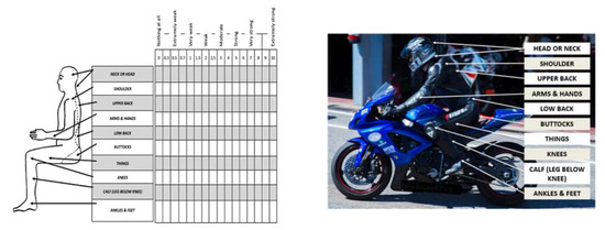 The left side of the body chart discomfort using the Borg CR-10 scale and the right side of the moto rider using the Borg CR-10 scale.