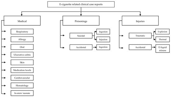 Tzortzi, A.; Kapetanstrataki, M.; Evangelopoulou, V.; Behrakis, P. A Systematic Literature Review of E-Cigarette-Related Illness and Injury: Not Just for the Respirologist. Int. J. Environ. Res. Public Health 2020, 17, 2248. https://doi.org/10.3390/ijerph17072248