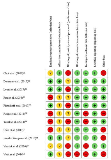 Two reviewers (AGS and PS) independently assessed quality and risk of bias of included studies using the PEDro scale and the Cochrane Collaboration’s risk of bias tool. The PEDro scale is based on the list developed by Verhagen et al. []., using the Delphi method, and is constituted by 11 items: eligibility criteria, random allocation, concealed allocation, similarity at baseline, subject blinding, therapist blinding, assessor blinding, follow-up for at least 85% of subjects, intention-to-treat analysis, between-group statistical comparison and point, and variability measures. Of the 11 items, only 10 items contribute to the total PEDro score. The 10 items are scored as either present (1) or absent (0). The total score is obtained through the sum of the points assigned to each item []. The quality of included studies was considered high when the total score was 6 []. The Cochrane Collaboration’s risk of bias tool is constituted by the following domains: selection bias (sequence generation and allocation concealment), performance bias (blinding of participants and personnel), detection bias (blinding of outcomes assessment), attrition bias (incomplete outcome data), reporting bias (selective reporting) and other bias. Each domain was assessed as “low risk”, “high risk”, or as an “unclear risk” []. Disagreements between the two reviewers (PS and AGS) were solved by discussion until a consensus was reached.