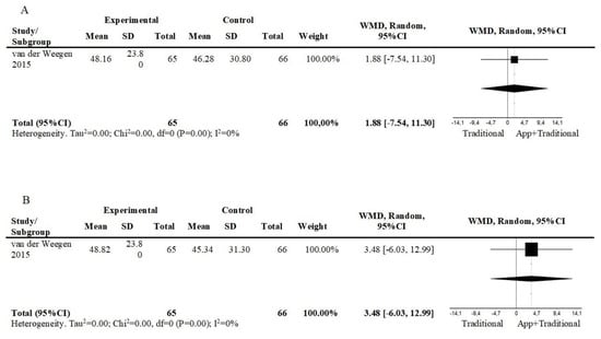 One study compared an intervention consisting of a mobile app, plus other interventions against a self-management plus usual care intervention. At short term, there was a small and non-significant effect in the group using the app at short term (1 study; n = 131; WMD = 1.88; 95%CI = −7.54, 11.30) (Figure 4A), and at follow up (12 weeks) (1 study; n = 131; WMD = 3.48; 95%CI = −6.03, 12.99) (Figure 4B).