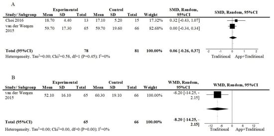 Forest plot of comparison, outcome: self-reported self-efficacy in exercise/physical activity: (A) App+Traditional vs. Traditional, short term. Abbreviations: CI, confidence interval; df, degrees of freedom; SMD, standardized mean difference; (B) App+Traditional vs. Traditional, follow-up. Abbreviations: CI, confidence interval; df, degrees of freedom; WMD, weighted mean difference.