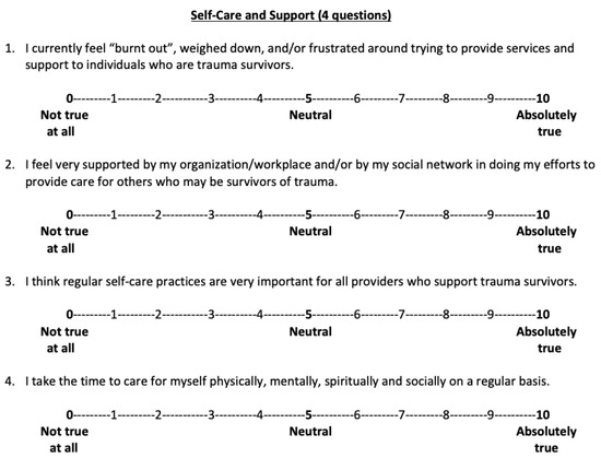 Self-care and support. This was a four-item self-report questionnaire that was also created specifically for this workshop by the author team. This self-report was used to measure participants’ attitudes regarding self-care prior to the start of the workshop only. Each question was rated using a 10-point Likert scale, with higher scores indicating better self-care attitudes and behaviors, with the exception of question 1 where higher scores indicated greater feelings of burnout. See