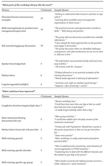 Feedback about workshop. Numerically rated questions and open-ended, qualitative data were also collected at the end of the workshop from each participant to evaluate the usefulness of the workshop, and also, in part, to understand the community’s interest and other potential areas of need that may not have been covered by the current workshop. Feedback was collected using two questions using a 10-point Likert scale assessing for the success of the workshop in meeting its goals (to increase knowledge about trauma and its effective treatments, and effective ways to engage in self-care), and three open-ended questions with written feedback specifically on (1) what aspects participants found helpful about the workshop, (2) what could be improved, and (3) additional topics and training that would be useful for participants to receive further training on in the future.