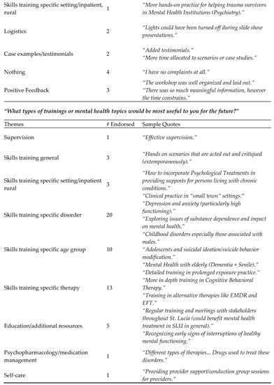 In addition, this training opportunity was limited to providers in St. Lucia. Given that the wider Caribbean region experiences some of the same lack of training resources (coupled with similarly high trauma exposure rates), it would have been ideal to provide this training (either in-person or remotely) to providers in other countries in the region as well, and to utilize advances in telehealth to do so [