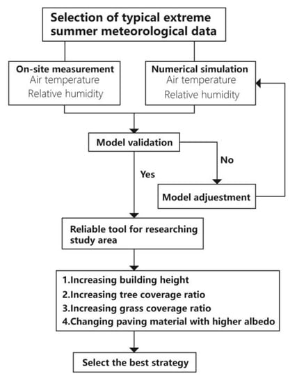 The methodological framework of this study is shown in Figure 1. On-site measurement is carried out, where the measured data are compared to the output results of ENVI-met by linear regression and the index RMSE (root mean square error) to validate the simulated performance. After that, we put forward some scientific hypotheses to understand the effect of different mentioned urban design parameters in cooling the thermal environment, this helps to the select the nest strategy to improve people’s thermal comfort and health.