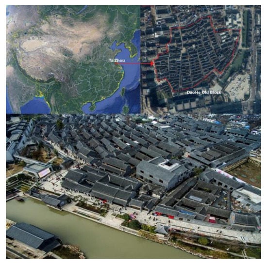 Due to the effect of the monsoon climate, Tai Zhou city (Southern China) is very hot and humid in the summer [16]. The current study was conducted in Dao He Old Block, which is a Chinese traditional architectural settlement from ancient times and is now a famous scenic spot of the city that attracts many tourists every year [17] (Figure 2).