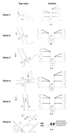 The selected first point (point-1) is in a northwestern street, aspect ratio (H/W) being 4.6, and this point has the highest aspect ratio in this commercial zone. Like point-1, point-2 is also a northwestern street with a different H/W, being 1. Different from the former two points, the third point (point-3) is in a north–south directional street, with the H/W being 2.3. Like point-3, point-5 is also located in a north–south directional street with a higher H/W, being 2.75. In addition, point-4 is in the unique north-western street of the research site, and the last point (point-6) is located in an open space, which is covered by a little vegetation (Figure 4 and Table 2).