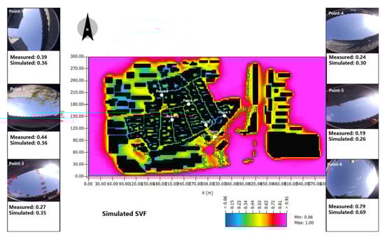 Another step to ensure the accurate geometry of the selected points in the model built by ENVI-met is a comparison of the simulated and measured SVF. The results of the measured results of the SVF are calculated by the software Ray-man, which can calculate the SVF through the hemisphere photo captured by a fish-eye camera. The simulated result can be conducted by the ENVI-met. The final validation between these two shows a small deviation—this means the simulated model can reflect the real conditions of the selected research site (Figure 5).
