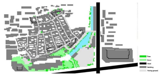 The initial input data of the various meteorological elements used in the ENVI-met simulation are shown in Table 5. In this study, the whole simulation was conducted over a 48-h period, starting from midnight 00:00 on 30 July 2016, with calculations every 1 min. The simulation results were output on an hourly basis. The simulated model in ENVI-met is shown in Figure 8.