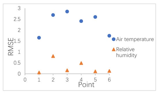 To quantify the gap between the measured and simulated data, the root mean square error (RMSE) was calculated for each selected point. The index RMSE is a significant factor for calculating the error and has been widely used in previous studies [24,25]. If the RMSE can reach or approach zero, the most accurate model can be achieved. A lower RMSE value means that the simulated results are within the measured value. Figure 8 shows the RMSE values between the measured and simulated air temperature and relative humidity.