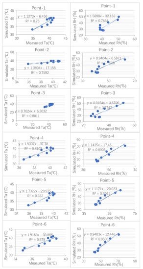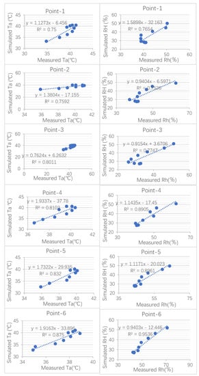 As is shown in Figure 9, point-3 had the highest error in the daytime, which reached 2.85 °C. This error can be attributed to the position of the recording machine. Due to consideration for tourist safety, the data instrument was not fixed in the middle of the street but instead was fixed along the sidewalk. In addition, the accuracy of the relative humidity was better than that of air temperature. As well as the index RMSE, analyzing the correlation between the simulated and measured data was another step in evaluating the numerical simulation. To test the validity of the simulated model, the measured data were fitted with the simulated data by linear regression. A good liner regression was obtained, as shown in Figure 10 and Figure 11, where R2 values for air temperature of this region ranged from 0.75 to 0.9578, while those for relative humidity were between 0.7518 and 0.9813. In reality, the deviation between simulated and measured data may have been caused by anthropogenic heat from human activity. These results are similar to or even smaller than those from previous studies [26,27,28]. The final linear regression values proved that ENVI-met is valuable software that can be used to fulfil future research as part of this study.