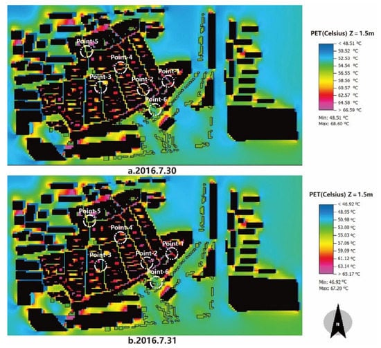 The PET of the selected points at 3:00 pm. (a): First day; (b): Second day.