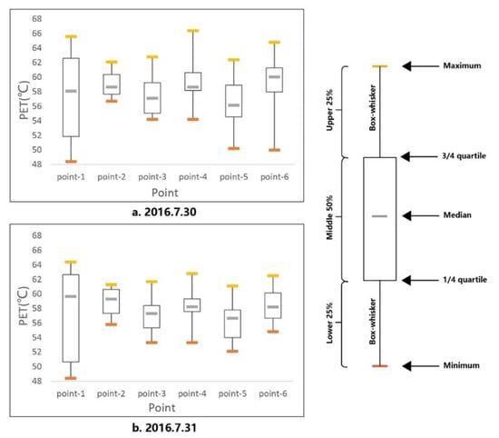 Figure 12a indicates the thermal sensation in the first measured day, in which the lowest PET was 48.51 °C and the highest value reached 68.60 °C. According to the thermal sensation for hot-summer and cold-winter climate zones of southern China, nearly the entire block was within the “hot” and “very hot” zones. Due to the different weather conditions in the two measured days, we used the published data from the local weather station. It was clear that the average air temperature in the first measured day was 1 °C higher than that in the second day, which directly led to a higher PET value in the daytime. Figure 12b shows that the PET values at 3:00 pm ranged from 46.92 °C to 67.20 °C. It was even lower than the first day; however, the entire region was still in the “hot” and “very hot” zones. According to previous studies, it is evident that a stronger cooling effect is obtained with a higher background daytime air temperature [32,33]. In addition, the effect of paving material with higher albedo is better at reducing surface temperatures on sunny days than on cloudy days [34]. It has also been shown that the positive effect of vegetation on hot, sunny days is two times higher than on cold, cloudy days [35]. In this study, the hottest time appeared at 3:00 pm; therefore, the PET at 3:00 pm on 30 July was selected for calculations for further study.