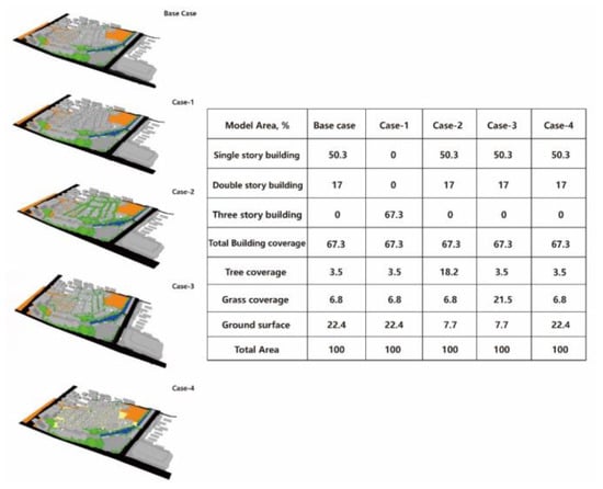 Based on the current conditions of the simulated model, the existing case was defined as the base, and four new cases were developed to compare and evaluate the cooling effects of different parameters (Figure 14).