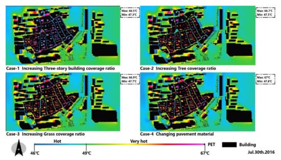 Under the new cases, the PET improvement appeared in the whole region. The peak time at daytime (3:00 pm) during the measured period is also compared at the pedestrian level (a height of 1.5 m) (Figure 15).