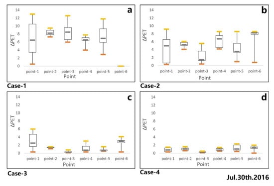 The box plot figure, reflecting the comparison among a series of group data, is established under the existing scenario (Figure 13), in which the extreme summer PET is within 48.4 to 67.2 °C in all selected points.