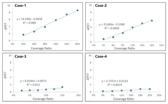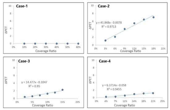 Different parameters had different effects in improving thermal comfort at the hottest times during the measured period. Multiple regression analyses of ∆PET values of the different parameters at 3:00 pm were conducted to assess the contribution of these to improving thermal comfort. The correlation coefficient (R2) between PET and different parameters served to describe the proportion that could be explained by the variables of the regression model [35]. A strong positive correlation was found between the percentage of trees (case-2) and ∆PET, with the correlation coefficient being 0.9713. It was observed that a 3% increase in the coverage ratio of trees reduced PET by 0.78 °C at the hottest time during the extreme summer. Meanwhile, an irrelevant relationship between building height and ∆PET was observed (case-1), which meant that increasing building height could not effectively improve thermal comfort in open spaces. The other parameters, including grass (case-3) and pavement material (case-4), could reduce PET, but the extent was limited.
