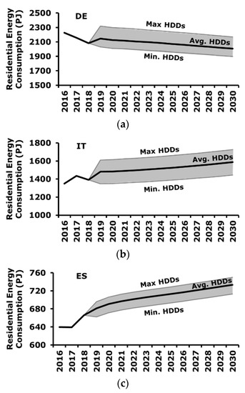 Forecasting of residential energy consumption for the different HDDs scenarios: (a) Germany: Min HDDs = 2661, Avg. HDDs = 3028, Max HDDs = 3630; (b) Italy: Min HDDs = 1635, Avg. HDDs = 1896, Max HDDs = 2166; (c) Spain: Min HDDs = 1563, Avg. HDDs = 1781, Max HDDs = 1972.