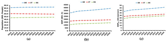 GDP in nominal values is shown in Figure 2c [34]. It can be seen that, as expected, Lithuania has a much lower GDP with respect to the other considered countries, but with a similar trend. The figure highlights that from 2000 to 2008 a constant growth of the GDP was observed in all the countries. Then, in 2009 there was the global economic crisis and in all the considered countries there was a noticeable reduction of the GDP. On the other hand, after 2009, German GDP continued to increase and in 2010 pre-crisis values were reached. A similar situation happened in Lithuania where in 2012 pre-crisis values were surpassed. A different context is observed in Italy and Spain where there was a stagnation of the economy where pre-crisis values were obtained again in 2015.