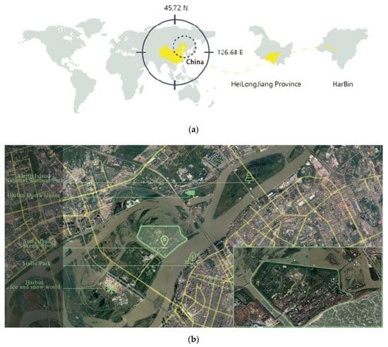 Figure 1. Site location analysis: (a) location analysis of Harbin; (b) geographical location of the experimental site.