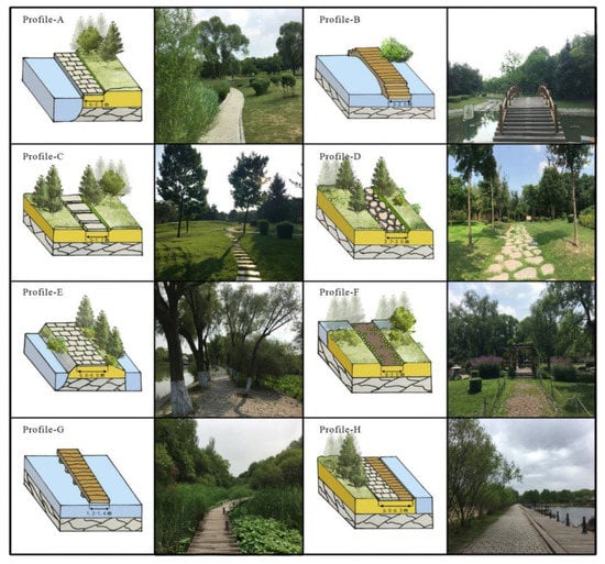 As shown in Figure 8, the eight studied sections can be divided into three types of path spaces: wetland spaces, waterfront spaces (including sections A, B, E, F, G, and H) and open spaces in forests (sections C and D). Perceived restorative effects observed before and after introducing birdsongs are shown in Figure 3. We found effects of the three types of path space on ductility to increase significantly after introducing birdsongs. Kruskal–Wallis testing was performed for each section and four characteristics, as shown in Appendix A Table A5. Of the paths through wetland and waterfront spaces and those through open forested space, scores for the paths through open forested space increased the most after introducing birdsongs. Paths through the waterfront space generated a higher overall visual perception recovery efficiency value than wetland paths. We found no significant difference between the two after introducing birdsongs, but improvements in wetland path perceptions and restorative effects were stronger than those for the waterfront space.