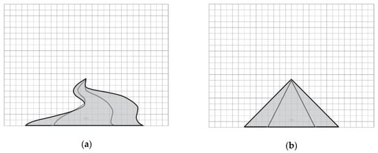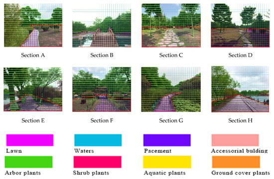 The grid pixel method used by H. Nordh [31] was employed to quantify the landscape elements of the selected sections and summarize their spatial landscape characteristics. First, each section was divided into a grid of 588 (21 × 28) squares, with each square sized 5 × 5 mm2 and each section area covering 14,700 mm2. Next, different landscape elements were selected as variables (i.e., hard surfaces such as pavement and sketch; soft surfaces such as grassland, groundcover, shrubs, trees, and aquatic plants; water bodies; and sky), and different colors were used to distinguish between landscape elements. The images were then marked and the numbers of relevant pixels were calculated, as shown in Figure 3.