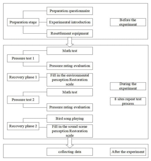 To enhance the authenticity of the data, experiments were carried out in the field. The flow is shown in Figure 4. Eight nodes in the park were selected to find tourists to answer the questionnaire. The researcher first introduced the questionnaire and had participants answer questions on their personal backgrounds and recent stressful encounters. The researcher then initiated a two-minute arithmetic problem pressure stage and asked participants to complete the (Perceived Restorativeness Scale (PRS)) environmental perception recovery semantic scale regarding their views on the surrounding environment and semantics (Table 3). This scale was developed by HARTING (1996) on the basis of four basic characteristics of restorative environments proposed by Kaplan and his wife, and was later adapted by Laumann and R. Pals et al. to form a complete restorative scale. Attractiveness represents a fascination with an environment, measuring the attraction an individual feels to the surrounding environment and its ability to stimulate pleasant positive emotions. Being away represents the stability within an environment, aiming to measure the degree of relaxation in the environment. The more relaxed a person is in an environment, the less psychological pressure and reduced fatigue they experience. Extensibility represents the spatial connection in an environment and aims to measure the scale of the environment while improving the space-time dimension of people’s imaginations and the potential for exploration. Compatibility represents tolerance in an environment, aiming to measure comfort in the surrounding environment including an individual’s sense of harmony and immersiveness [1]. Thirteen points were used in the semantic scales. The semantic scale was divided into seven levels from +3 to −3 to indicate strongly agree to strongly disagree, respectively. Finally, the two-minute arithmetic question pressure stage was completed again using a small audio device (JBL flip4 /State of California, USA) to play a recorded birdsong at a height of 4 m. After the birdsong was played, the Perceived Restorativeness Soundscape Scale included in the soundscape recovery section of the questionnaire was completed (the scale includes 13 questions with each characteristic measured with two to three questions).