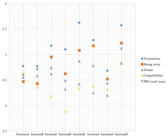 The total score for landscape perception restoration is the mean of scores measured for the eight sections. Statistical analysis of variance for the data of perceptual landscape restoration factors was conducted. The results show that there was no significant difference among different profile samples for Compatibility of 1 item in total, and there were significant differences among each profile sample for Fascination, Being away, Extent, and PRS of 4 items in total, as shown in Table A3 in the Appendix A. Figure 6 shows that section H had the highest average score of 5.11, while section G had the lowest average score of 4.43. This shows that large areas with water and tall trees can quickly calm park visitors, relieve pressure and tension, and maximize the benefits of perceived recovery.