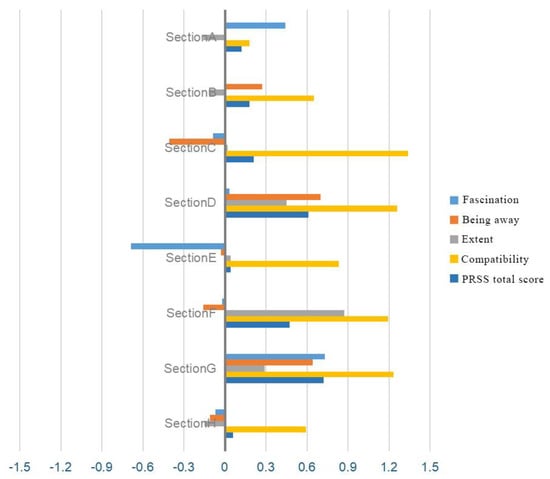 The evaluation results of the perceived landscape restoration factors focused on the following: Fascination, Being away, Compatibility, and Extent. Kruskal–Wallis test statistics were added to the analysis as shown in Table A4 in the Appendix A. The analysis shows that there was no significant difference between two items of Compatibility and Extent in different profile samples. In addition, there were significant differences among the three sections of Fascination, Being away and PRS. The following analysis is presented: