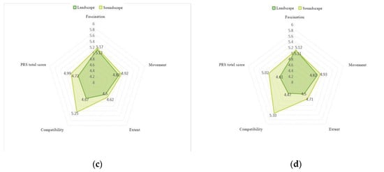 Figure 8. Restorative benefits observed for different paths: (a) water’s edge (waterfront space), (b) water’s edge (wetland), (c) waterfront space and wetland, and (d) clearing in the woods.