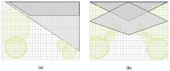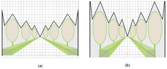 Figure 10. Taking the simplest planting method as an example: (a) vegetation pattern minimum; (b) vegetation pattern maximum.