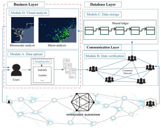 Communication layer. This layer contains the network structure and protocols of the P2P network (Module B). It provides network services for the blockchain platform and uses the Gossip data communication protocol to achieve state synchronization and data distribution between nodes in the network. Due to the use of Hyperledger Fabric, nodes in the communication layer are assigned different roles to execute various services []. The communication layer not only deals directly with the business layer, but also connects with the database layer. The uploaded data is verified by the consensus algorithm and then uploaded to the blockchain to achieve consistency and correctness of the ledger data on different ledger nodes. Consensus algorithms are the foundation of blockchain technology. PBFT (Practical Byzantine Fault Tolerance) is used in Hyperledger Fabric. The main steps are: (1) The client (user) sends a request to activate the service operation of the master node (regulator). (2) After receiving the request, the master node broadcasts the request to each node. (3) The client waits for responses from different nodes. If more than half of the nodes (for example, 51%) have the same response, it is the result recorded in the blockchain.