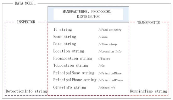 A custom data model is created, as shown in Figure 2. The data model includes detailed parameters such as its identification and information for uploading. There are nine fields in total, which are ID, Name, Date, Location, FromLocation, ToLocation, PrincipalName, PrincipalPhone, and OtherInfo. Among these, ID is the classification of food categories, such as: milk and dairy products, fats, oils and emulsified fat productsand cereals. Name refers to the sub-categories of food, such as high calcium milk. Date is the timestamp of data uploaded for each link. Location represents the geographical coordinates of the current link. The previous geographical coordinates are defined as FromLocation. ToLocation represents the next geographical coordinates. RunningTime is the transport time. PrincipalName the name of the principal in this link. PrincipalPhone represents phone calls of the principal. OtherInfo is the reserved field. Each link uploads a different type of data, but the ID and Name fields must be uploaded. Other fields can be filled out based on the specific link and role. The format of the key-value store sets the data format to JavaScript Object Notation (JSON). Therefore, these data models eventually need to be converted to JSON strings.