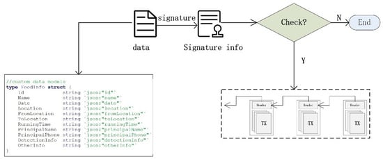 The process of data recording to the blockchain is shown in Figure 3. When a participant initiates a request, the system will call an embedded smart contract and then verify the data structure, signature integrity, and whether it is duplicated. After the verification is passed, the custom smart contract will be called to upload the data to the blockchain. Nodes in the blockchain network can access different information through different rights. In addition, digital signatures are used to ensure the integrity of the information. The digital signature in this research uses asymmetric encryption technology. It ensures that the information cannot be tampered with, and the identity information of the two nodes does not need to be disclosed. When the process is completed, the smart contract will automatically execute the content of the agreement. For example, during the transaction, both parties use asymmetric keys to encrypt and decrypt transaction information. It guarantees that the transaction information will not be tampered with maliciously, and solves the integrity problem in the transaction process.