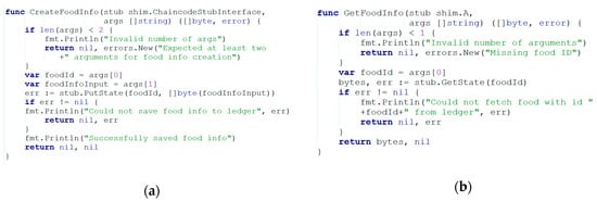 Hyperledger Fabric uses container technology such as Docker to host the “chaincode” (i.e., smart contracts) which include the system application logic. Smart contracts typically use the Domain-Specific Language (DSL) for development. These languages have specific restrictions for blockchain, like Ethereum. It is not only not conducive to the use of ordinary users, it also causes greater difficulties for developers. One of the features of Hyperledger Fabric is that it uses general-purpose programming languages such as Java, Node.js, and Go to develop smart contracts. It greatly reduces the learning costs for developers. In addition, it is the only channel for users to interact with Hyperledger Fabric and the only tool for performing transactions on the blockchain platform []. Based on these, we use smart contracts to implement the operations of recording data to the blockchain and downloading data, as shown in Figure 4.
