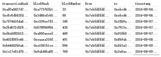 As shown in Figure 5, using the blockchain platform to store the sampling data can meet the following security requirements: (1) Privacy protection. The merchant information stored in the block is hash encrypted (from and to). It does not disclose any private information about merchants, thus achieving privacy protection and improving security. (2) Data integrity. After the information is record into the block, it will correspond to a specific block number (blockNumber), and the block will be encrypted by the hash function to generate a unique hash value (blockHash). (3) Information security. Digital signatures are used to prove ownership, and the hash function is also used to encrypt transaction information (transactionHash). In addition, the use of digital signatures can prevent duplicate transactions. This ensures the security to a certain extent.