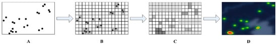 where x is the distance between sampling site and hotspot, is the scale factor of the function, and k is the influence factor. The larger of these two factors, the wider the range of influence. Equation (5) shows that its range of action is inversely proportional to distance. The influence of the center area is the largest, and the periphery is the smallest. When processing a certain area, it is necessary to add up all the heat values that can be generated in the surrounding area. Therefore, the final heat value of a certain region can be calculated by: