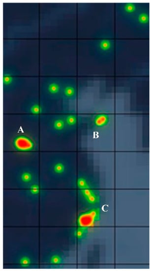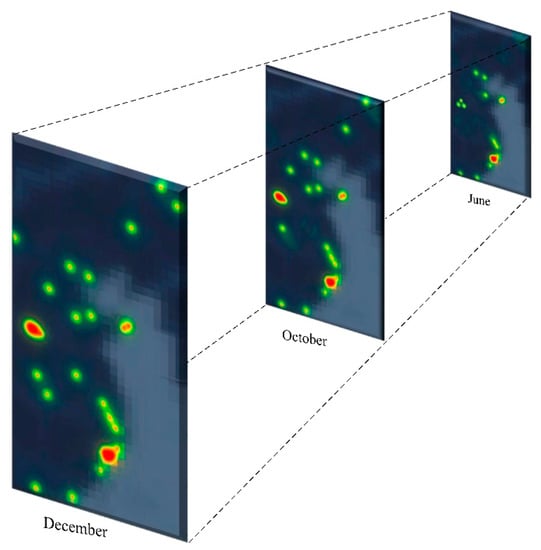 The heat map will show different results over time. In order to measure this, we built a 3D model similar to [,]. Figure 7 shows the results of the heat map changes from June to December 2016. In order to better present the results, we selected the results in June, October and December. From Figure 7, it can be seen that most of the areas where incidents appear are initially near the water. Incidents are concentrated in some areas. As time goes on, incidents have gradually emerged in inland areas and some areas have a tendency to concentrate. From June to October, in particular, this trend is obvious. For the areas where incidents occur, we use the results from December for analysis (see Figure 8).