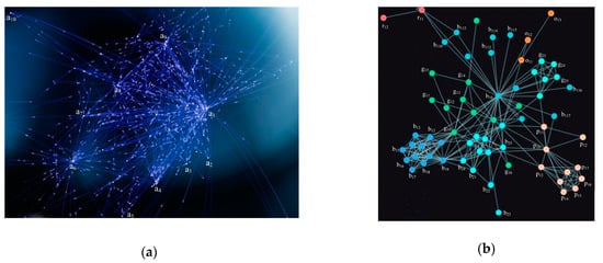 Force-directed graphs can be used to illustrate specific flow directions, since they make relationships clear. Force-directed graphs are mainly used in the visualization of complex networks such as social networks []. They show the relationship between multiple nodes. Nodes are configured in two- or three-dimensional space, and the relationship between them is represented by lines. These lines are almost equal in length and as far as possible do not intersect. Both nodes and lines are subjected to forces (Coulomb repulsion, Hooke’s law, and damping attenuation also should be considered []), which can be calculated according to the relative positions. The motion trajectories of the nodes are determined according to the action of the forces, and their energy is continuously reduced, eventually reaching a stable and balanced state. Through predefined points, edge weights, and other information, the force-directed graph can reflect the data flow direction according to the real-time state.