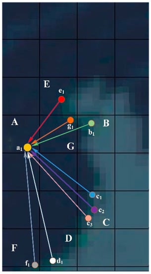 In order to provide effective evidence to facilitate the development of solutions, we need to conduct a traceability analysis based on the above results. We select a1 in Grid A for further analysis. As shown in Figure 9, the migration map and force-directed graph realizes the traceability analysis of unqualified products. These product parameters are shown in Table 2. However, the results presented in Figure 9 are too complex and greatly increase the difficulty of analysis. Thus, we simplified the original image for better analysis and produced Figure 10. As can be seen from Figure 10, the unqualified products appearing in a1 come from eight locations in grids B, C, D, E, F, and G, which are b1, c1, c2, c3, d1, e1, f1, and g1. These results reflect the flow of unqualified products. Analyzing these flow processes can help regulators in these regions perform better management. From Table 2 and Figure 10 it can be observed that the unqualified products appear in regions near the water. The regulations in these areas can be strengthened to reduce the occurrence of unqualified products. For example, regulators need to formulate stricter regulations, such as increased frequency of spot checks on products, and increased penalties for manufacturers of unqualified products [].