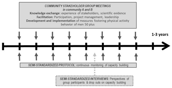 This study focused on the capacity building processes among community stakeholders. It was beyond the scope of the study to analyze the effectiveness of the sports activities that were developed and implemented by the stakeholder groups. Therefore, we have not assessed the impact of the measures (e.g., SportCard, leaflets) on the exercise behavior and health of the target group of older men. A pre–post survey in Community B is currently being performed to evaluate changes in physical activity [8]. In addition, it would be interesting to measure changes in anthropometry as well as biological markers, such as brain-derived neurotrophic factor [54], in those older men who took part in the various exercise offers that were launched in the two communities.