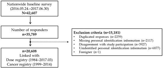 The design and methods of the KRWS were previously described in its protocol [10]. In summary, a nationwide self-administered survey of demographics, lifestyle factors, and work practices was conducted on 42,607 Korean radiation workers from 24 May, 2016 to 30 June, 2017 at educational institutions where all radiation workers receive radiation safety education every year; among them, 35,789 workers participated in the survey. After collecting the names and dates of birth of the participants through the surveys, we provided this information to the organization (i.e., Korea Foundation of Nuclear Safety) in charge of the national dose registry for linking radiation doses. We then requested another organization (i.e., Korea National Cancer Center) in charge of the national cancer registry to link the cancer status of all subjects identified from the dose registry. After excluding subjects who responded more than once, or who would not be able to complete follow-up due to unidentified personal identification numbers or disagreement with study participation, a total of 20,608 workers were enrolled in the cohort (Figure 1).