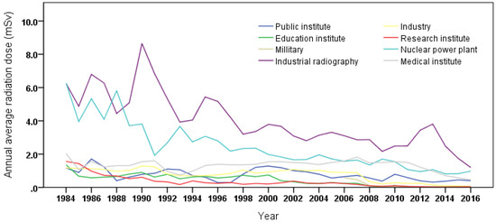 Overall, the annual average doses for the cohort gradually decreased over time from 4.5 mSv in 1984 to 0.6 mSv in 2016 (Table 3). The proportion of workers receiving doses >20 mSv continued to be less than 1% since the late 1990s (Table 3). Among the eight occupations, the annual average radiation dose of industrial radiography was higher than that of other occupations over time (Figure 2). The overall annual average radiation dose of industrial radiography was 2.69 mSv, followed by nuclear power plant workers at 1.56 mSv, medical institute workers at 1.03 mSv, and other occupations at less than l mSv.