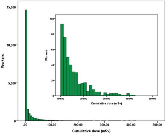 The distribution of the cumulative dose in the cohort skewed to the right (Figure 3). This is a typical distribution shown in most radiation epidemiological studies [11,12,13], with a mean cumulative dose ± standard deviation of 11.8 ± 28.8 mSv (range 0–417 mSv) and a median cumulative dose of 0.59 mSv (interquartile range 0–9.1 mSv). Radiation doses below recording level (i.e., ≤0.1 mSv, considered as a cumulative dose of zero) were recorded in 7901 (38.3%) workers; 431 workers had a cumulative dose of ≥100 mSv, corresponding to approximately 2% of the cohort.