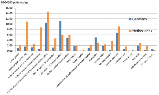 In 2017, the use of antibiotics among outpatients (in primary care) was 10.1 defined daily doses (DDD) per 1000 inhabitants in The Netherlands vs. 13.7/1000 in Germany [7]; i.e., about 33% higher. Prescribing data showed that different prescribing habits were observed especially for the group of other betalactam antibiotics, i.e., predominantly oral cefuroxime (Table 2).